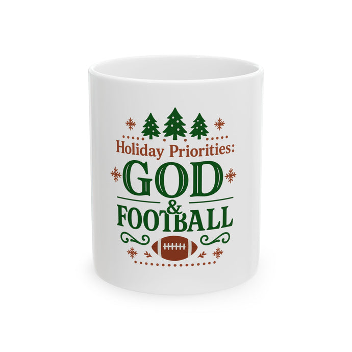 "Holiday Priorities: God & Football" White Ceramic Mug (11oz, 15oz)