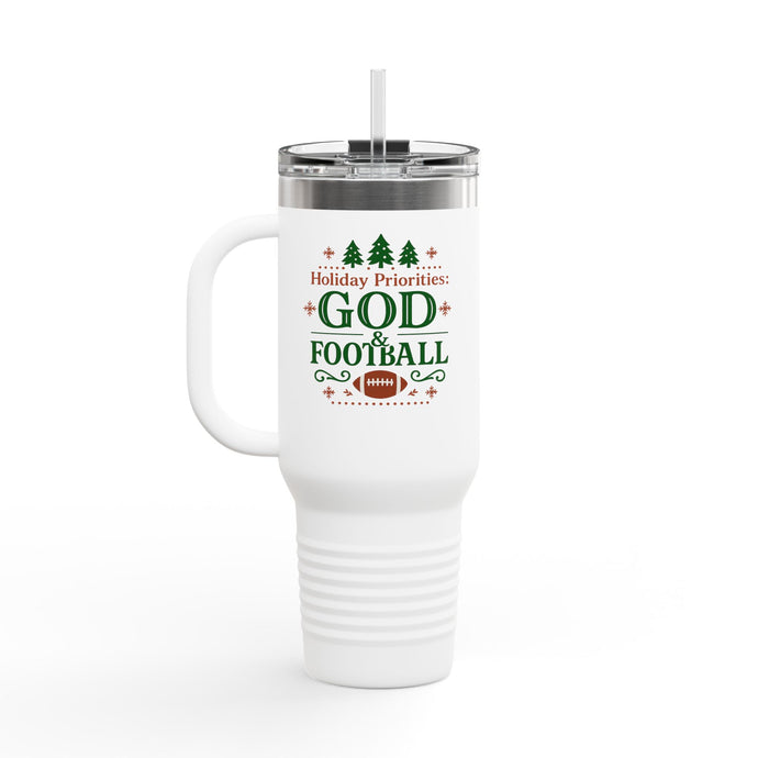 40oz Insulated Travel Mug — "Holiday Priorities: God & Football" Christmas Tumbler