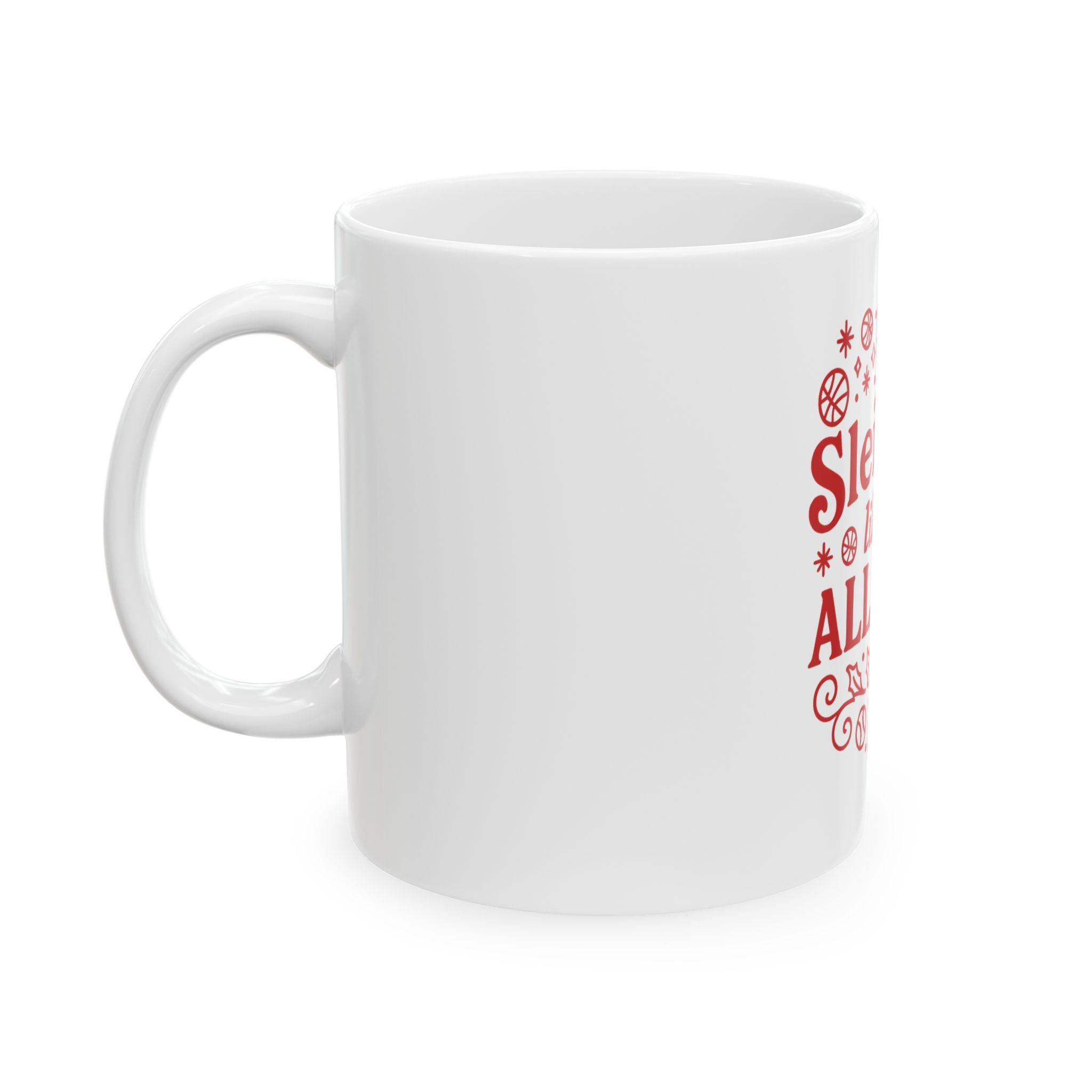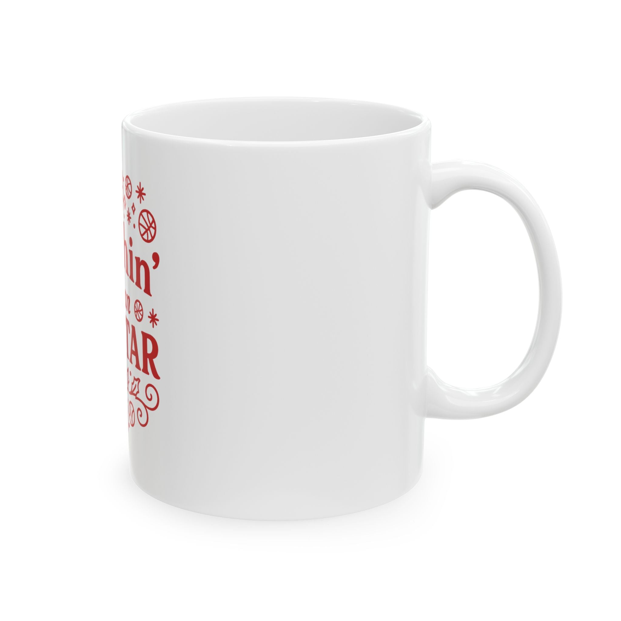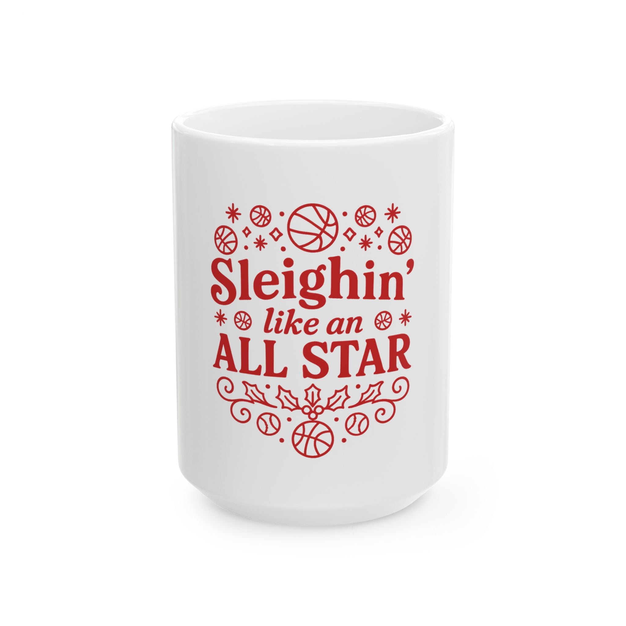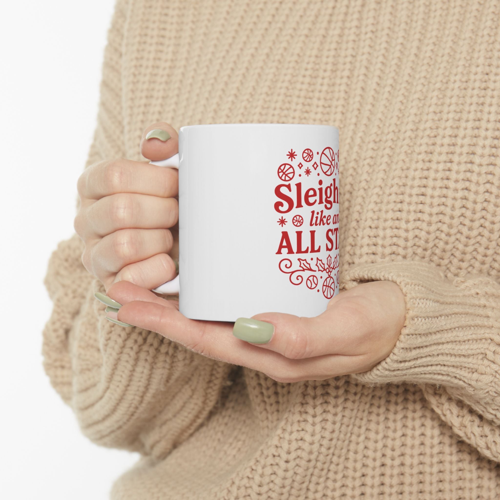 This glossy ceramic mug brings a playful, sporty twist to holiday mornings. Bright red lettering and basketball-themed ornaments spell out “Sleighin’ like an ALL STAR,” turning a simple coffee ritual into a wink of seasonal spirit. The smooth C-handle and shiny finish make it comfortable to hold and easy to display on a kitchen shelf or office desk. It’s sturdy enough for everyday use yet fun enough to pull out when festive energy hits — perfect for warming up before a winter game, gifting to a teammate, or sipping cocoa while wrapping presents. The crisp print stays vibrant through regular use, so the design keeps its punch year after year.