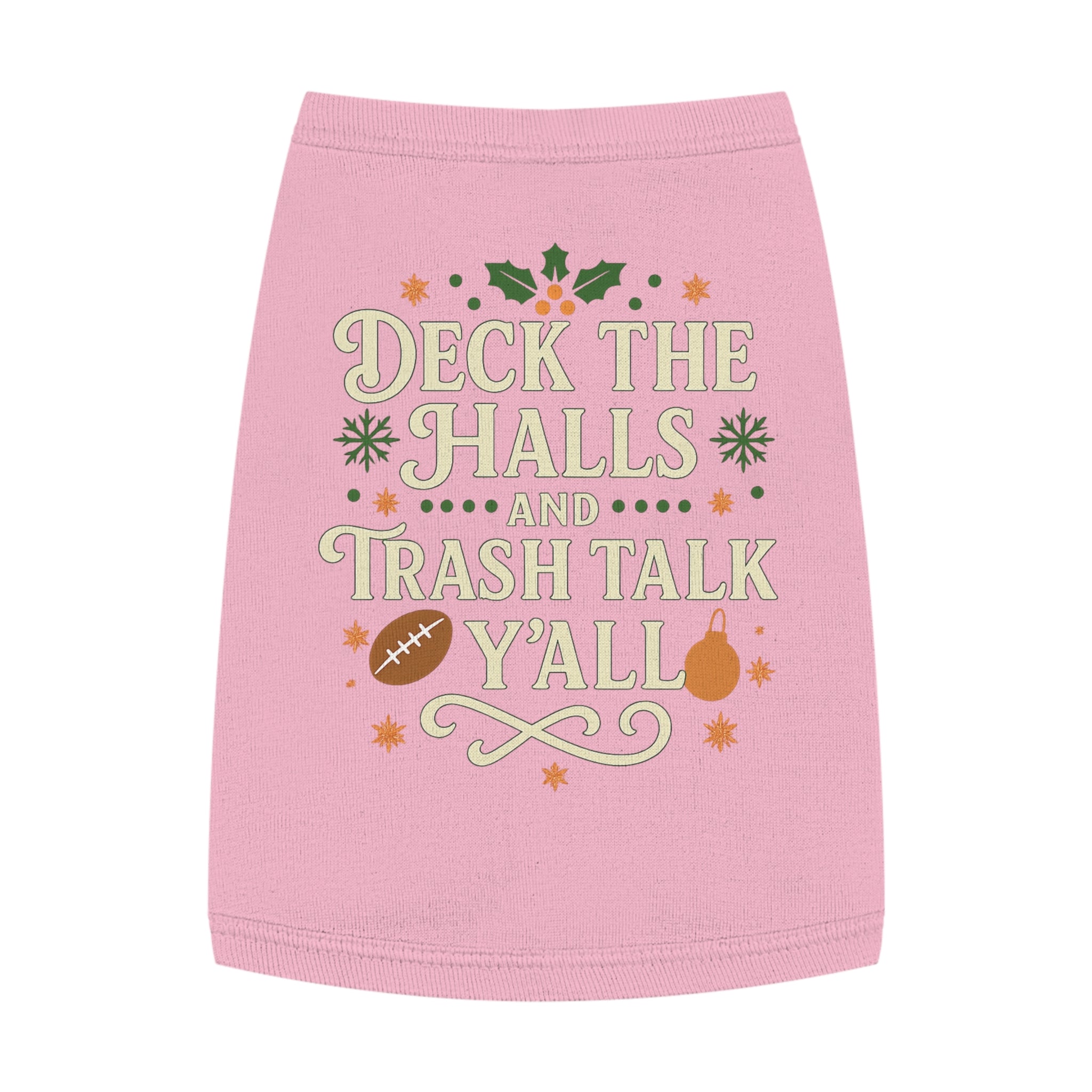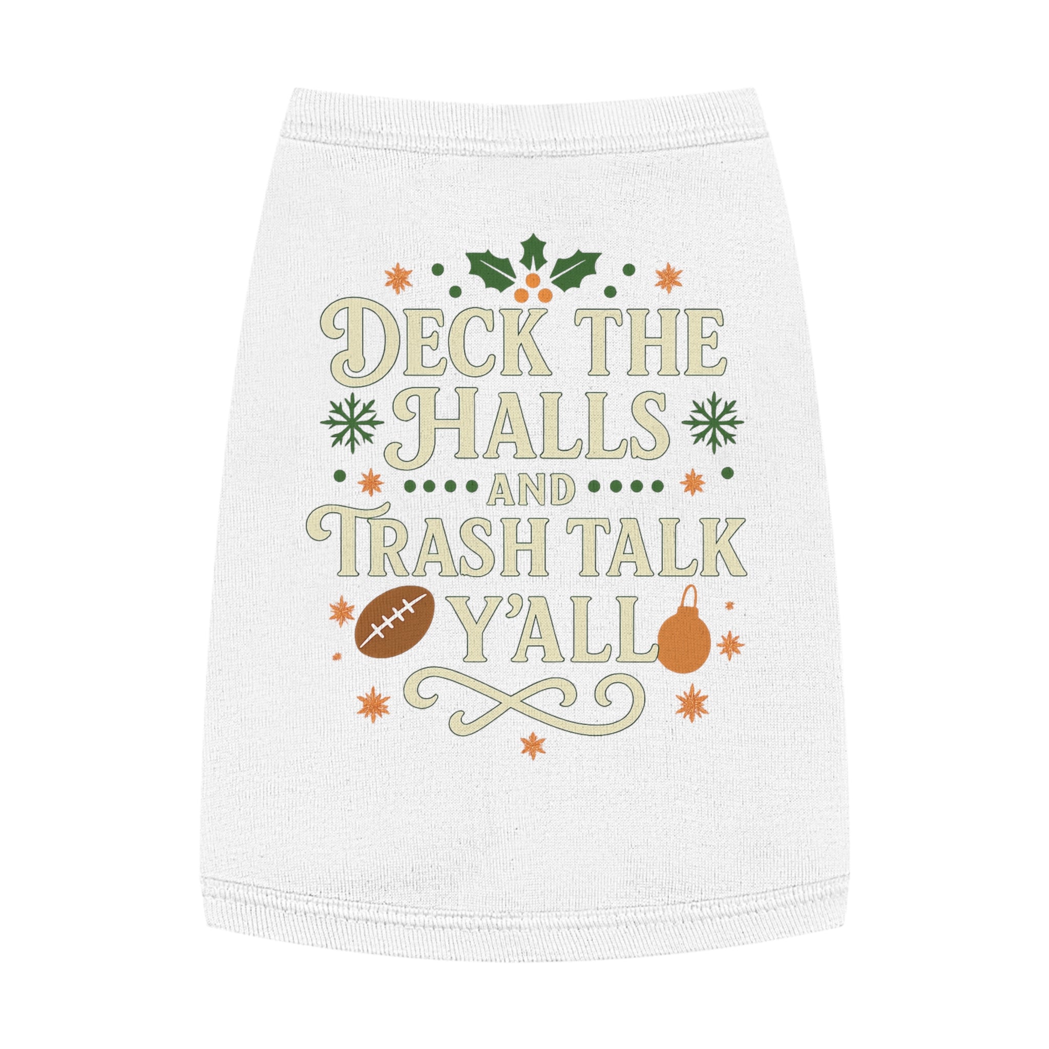 Bring holiday spirit and playful attitude to your pup’s wardrobe with this festive pet tank. The graphic reads “Deck the Halls and Trash Talk Y’all” surrounded by holly, football and seasonal accents — a cheeky nod to game-day gatherings and loud, loving households. Lightweight yet sturdy, the rib-knit fabric stretches for a snug fit and holds its shape through excited wiggles. Soft combed ringspun cotton feels gentle against fur while the double-needle binding keeps neck and armholes tidy after many wears. Outfit your dog for tailgate photos, family holiday cards, or couch-side cheering sessions with a piece that’s equal parts merry and mischievous.