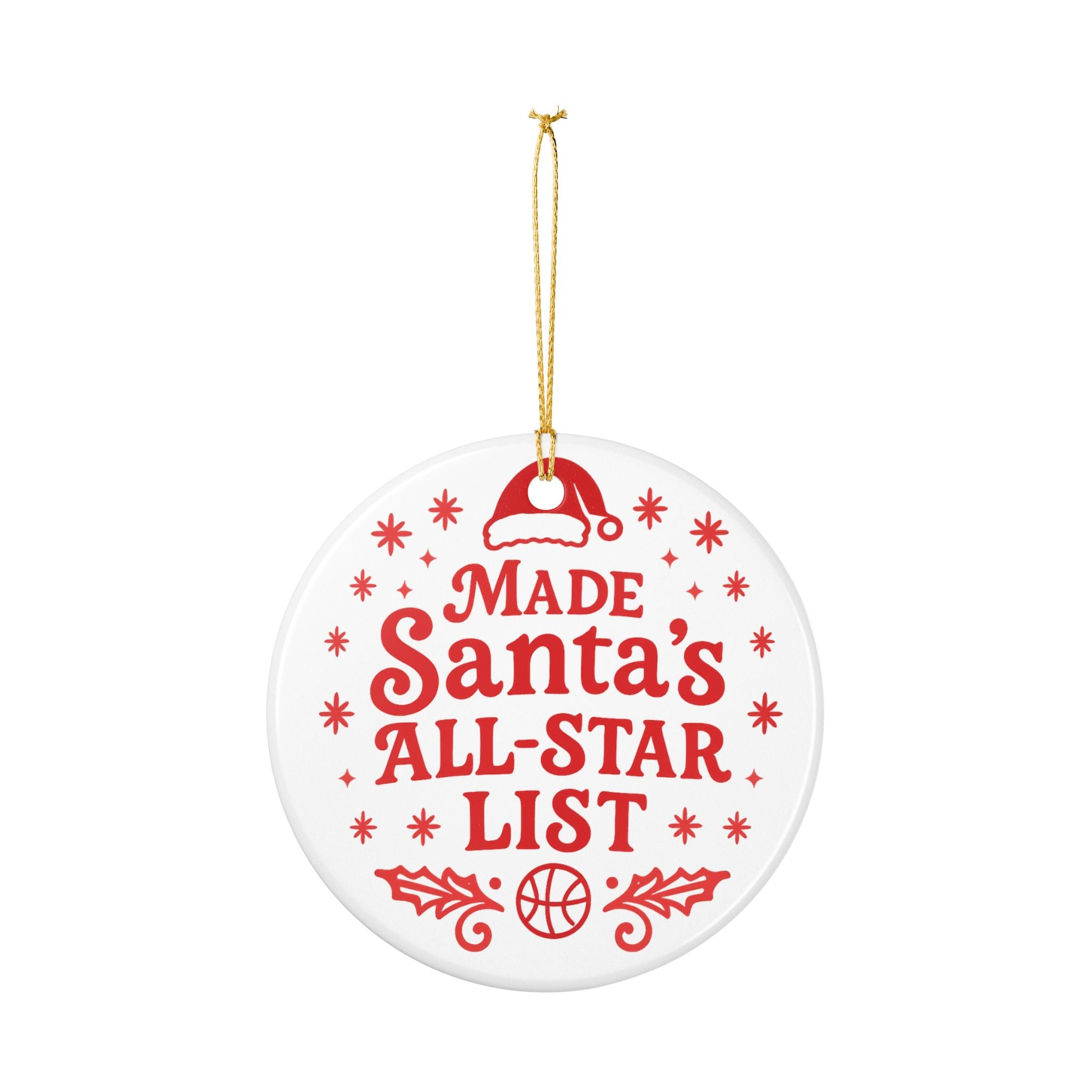 A bright, playful ceramic ornament that brings the court to the tree. Glossy white ceramic showcases a bold red design reading “Made Santa’s All-Star List” surrounded by festive stars, holly accents and a tiny basketball — a wink to sports lovers and playful families. Lightweight but sturdy, it hangs from the included gold string and adds a cheerful, athletic note to holiday décor. Use it to celebrate a young player’s season, a coach’s dedication, or to add sporty charm to mantel and tree displays.