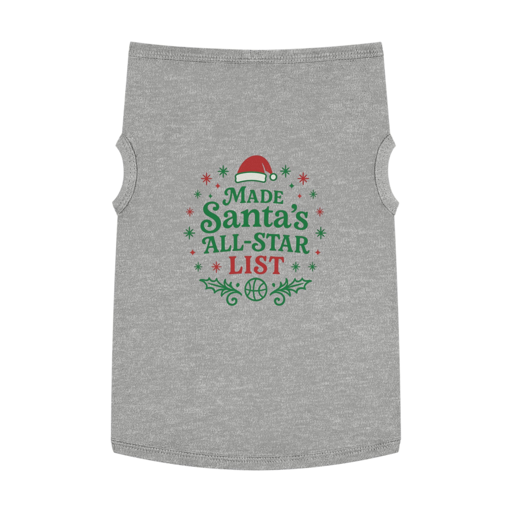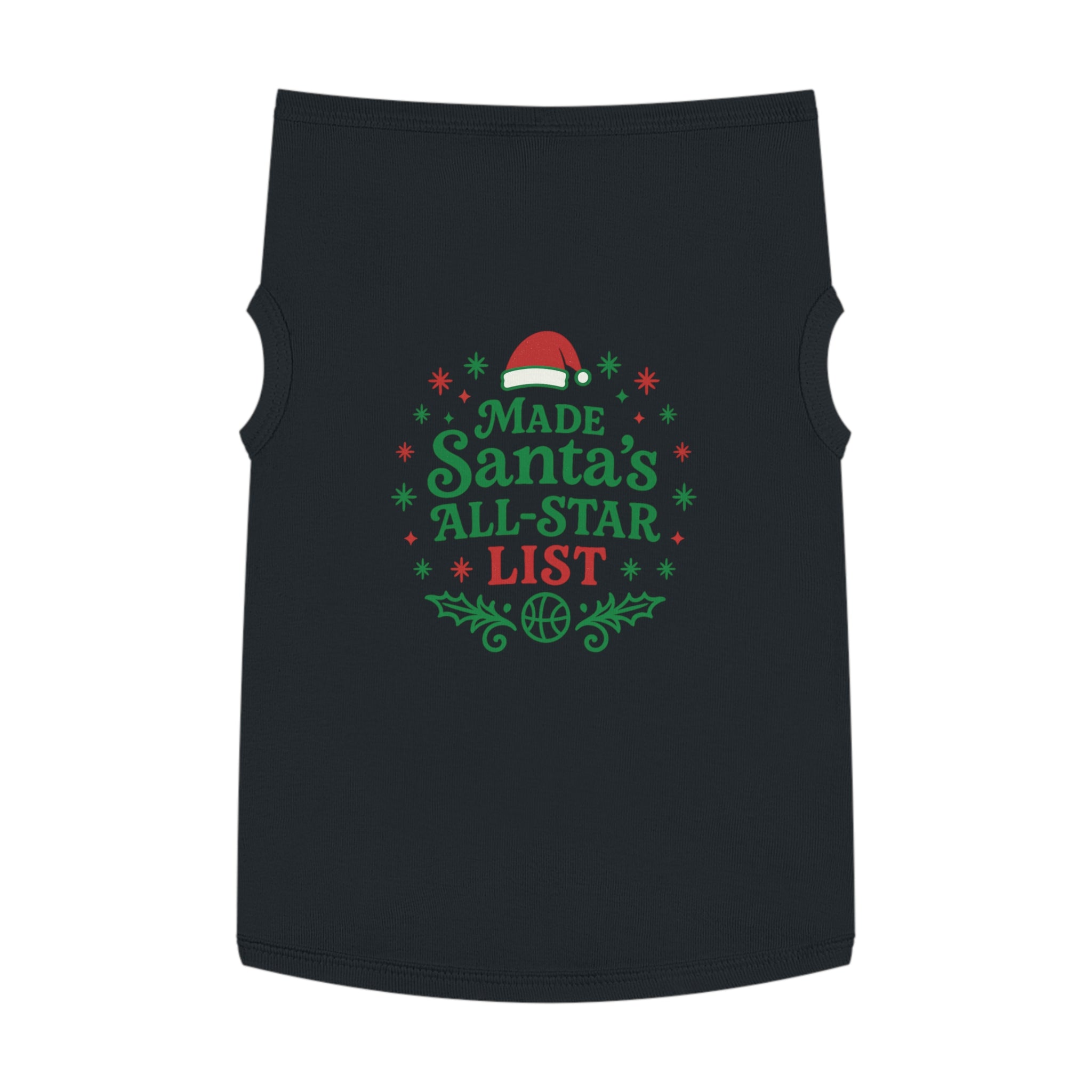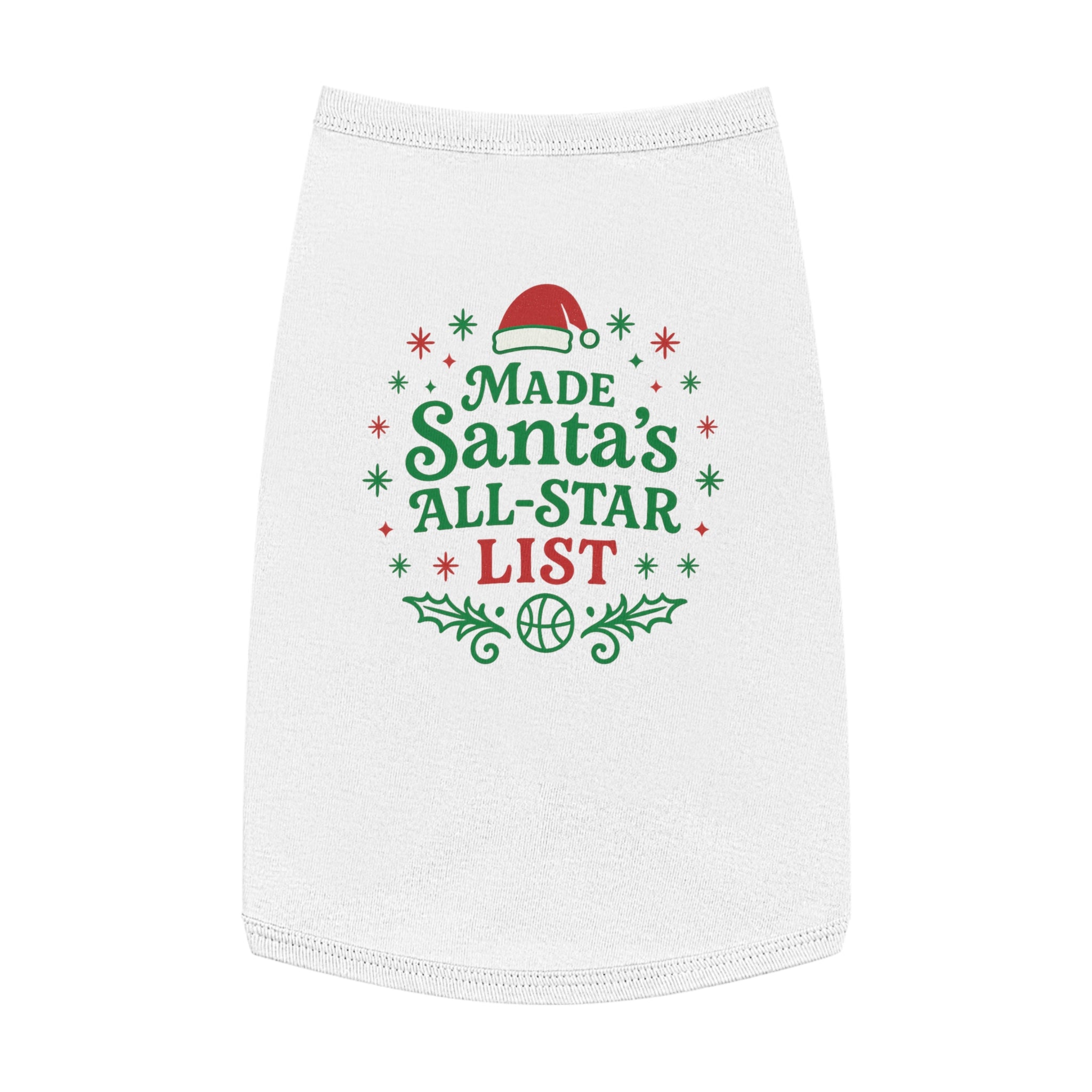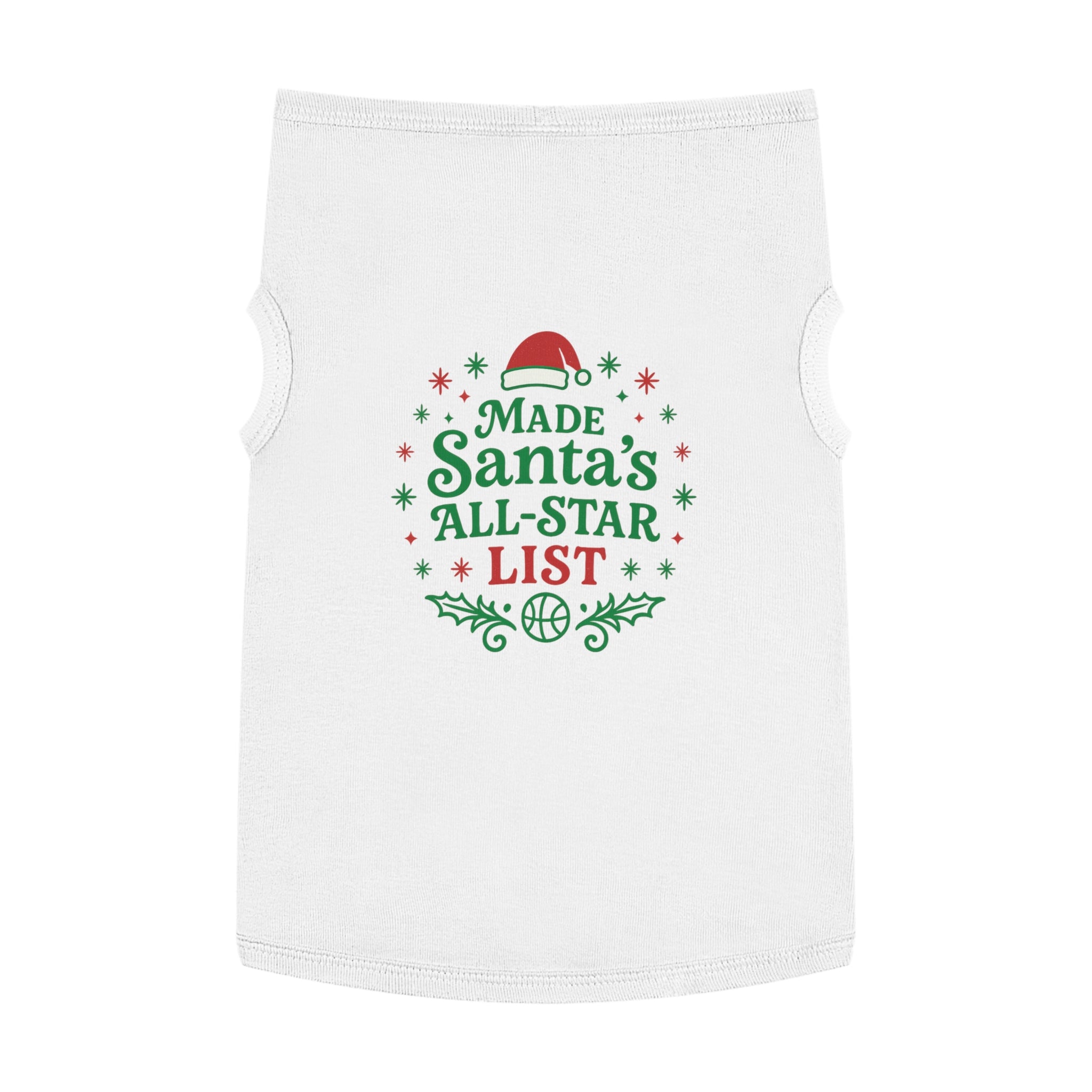 Curl up on the couch with your furry teammate decked out in holiday mischief. This pet tank wears its cheer loud and proud: bright red and green lettering declares "Made Santa’s All-Star List" surrounded by holly sprigs, snowflakes, and a tiny Santa hat—playful, seasonal, and unmistakably festive. The soft, medium-weight knit drapes comfortably over the chest and back, with elastic ribbing at the neck and armholes to keep the fit snug during walks, photo sessions, or while supervising gift wrapping. It’s for pet parents who treat their companion like family and want a bit of whimsical holiday spirit woven into everyday moments. Use it for cozy indoor gatherings, backyard photos, or when you want your pet to join the holiday team photo with personality and comfort.