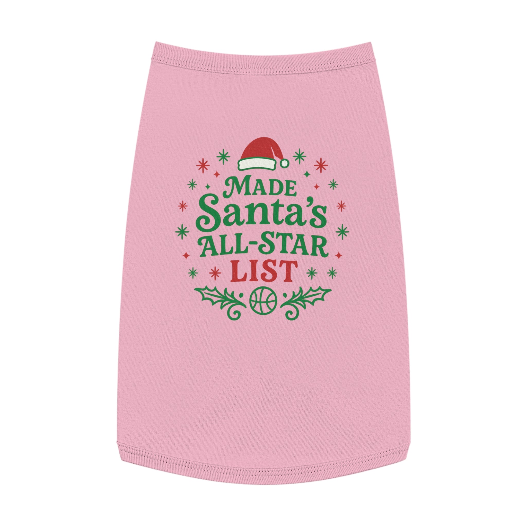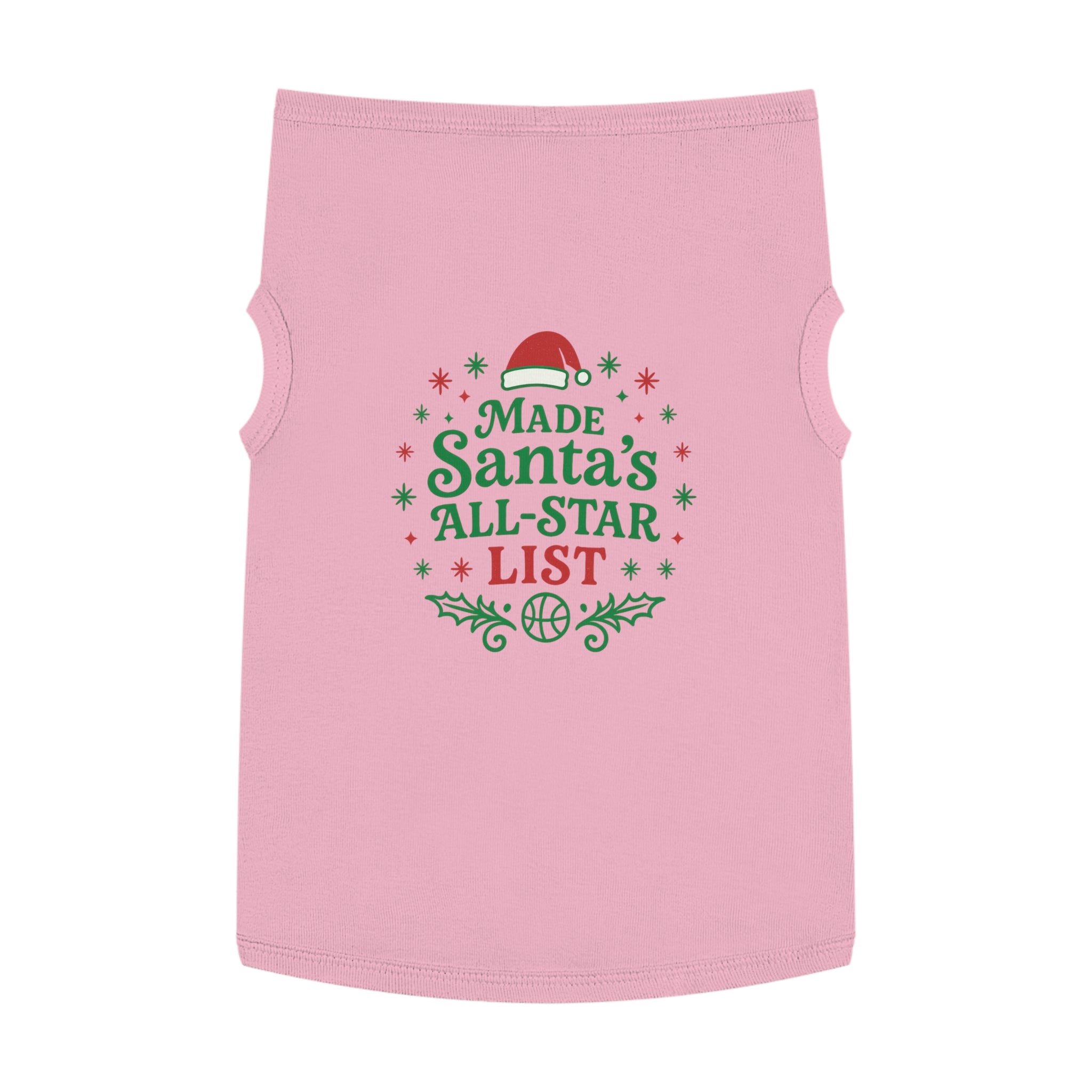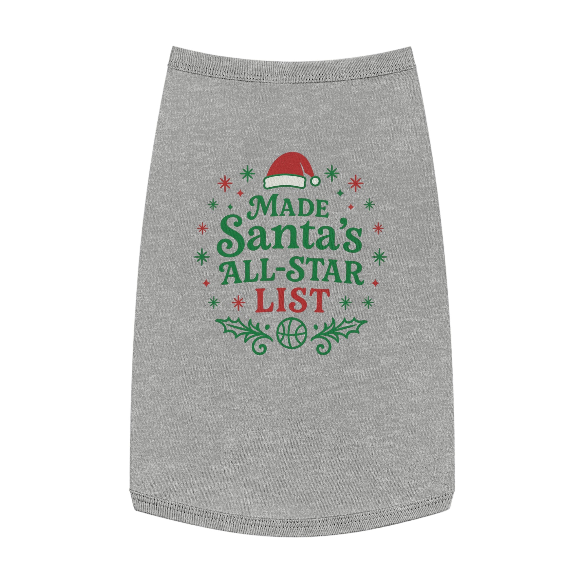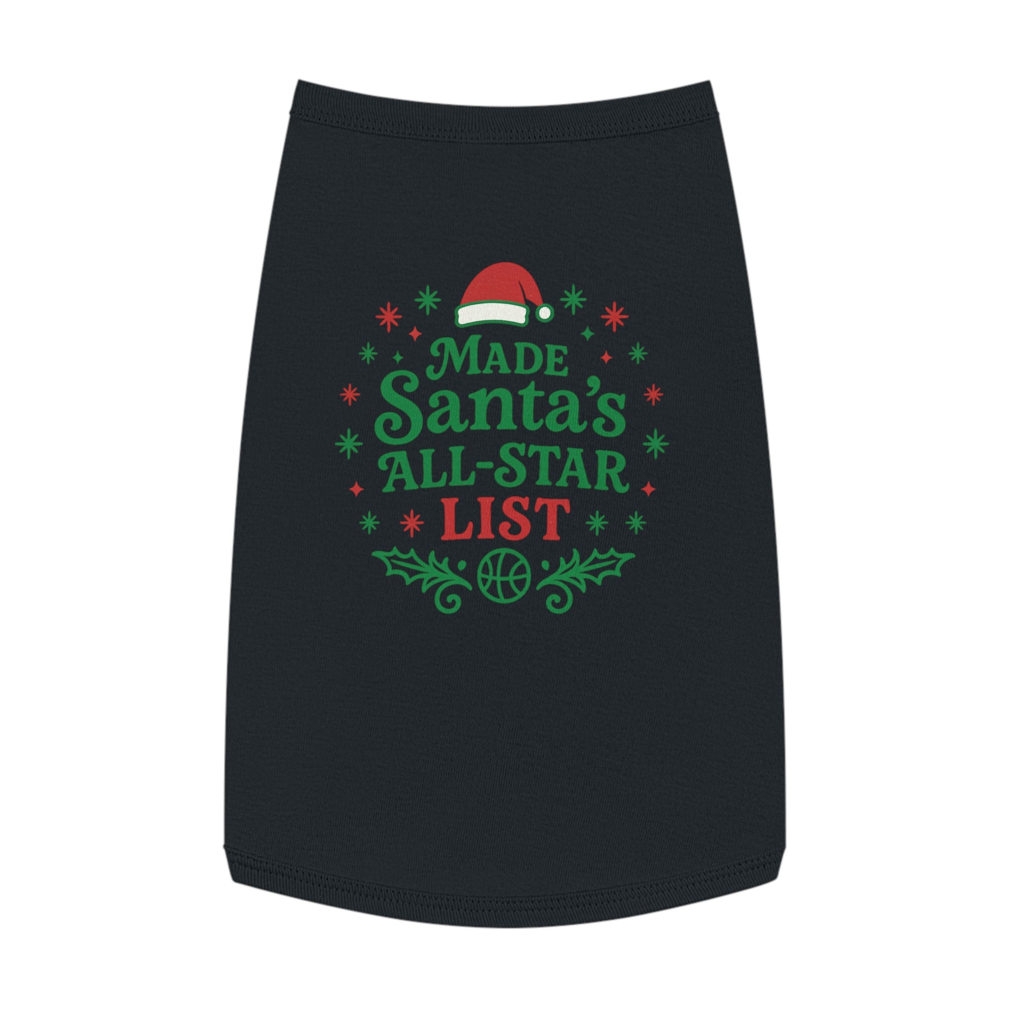 Curl up on the couch with your furry teammate decked out in holiday mischief. This pet tank wears its cheer loud and proud: bright red and green lettering declares "Made Santa’s All-Star List" surrounded by holly sprigs, snowflakes, and a tiny Santa hat—playful, seasonal, and unmistakably festive. The soft, medium-weight knit drapes comfortably over the chest and back, with elastic ribbing at the neck and armholes to keep the fit snug during walks, photo sessions, or while supervising gift wrapping. It’s for pet parents who treat their companion like family and want a bit of whimsical holiday spirit woven into everyday moments. Use it for cozy indoor gatherings, backyard photos, or when you want your pet to join the holiday team photo with personality and comfort.